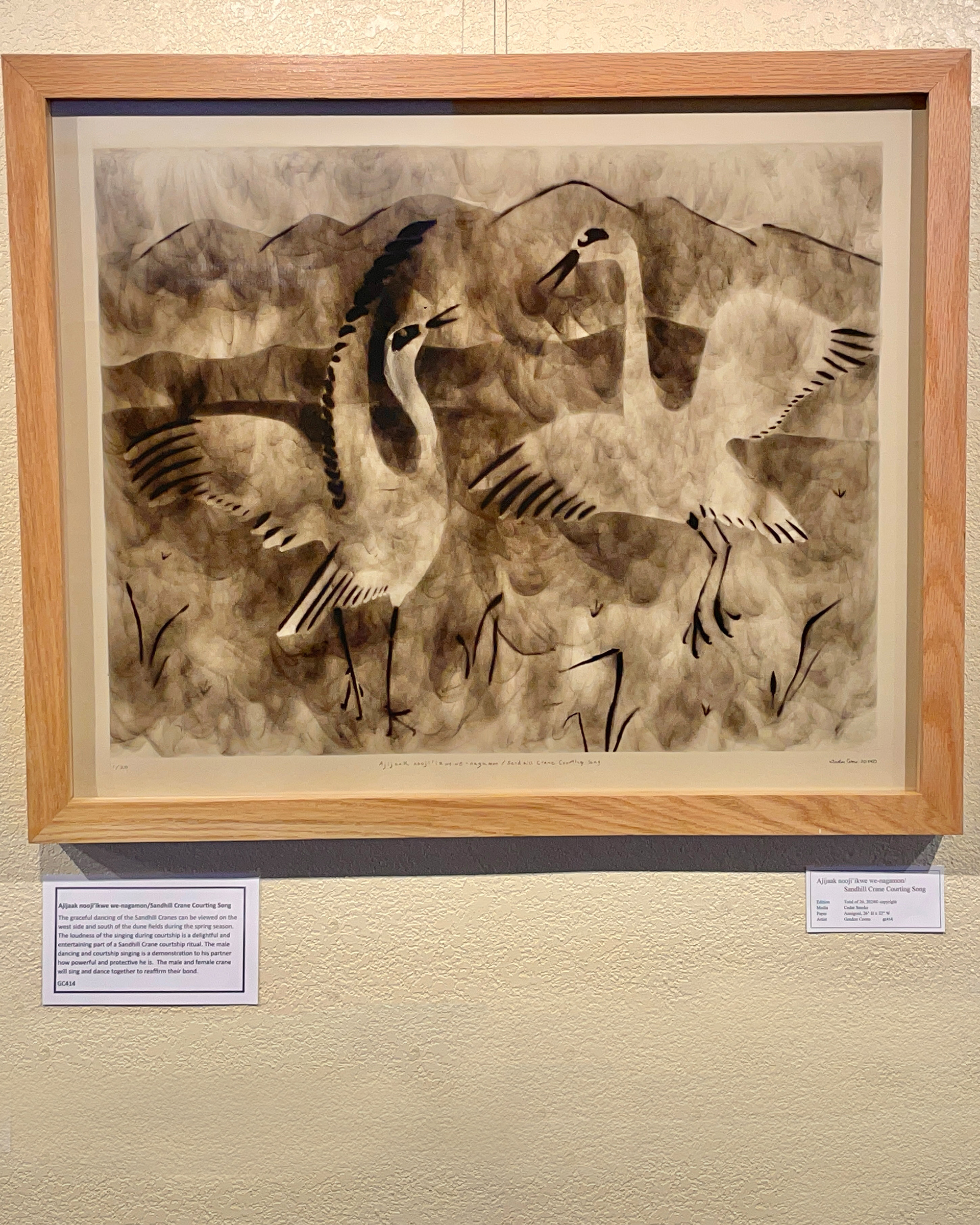 His imagery is of animals and natural features in the park and preserve as seen through his unique vision and traditional Native stories. Most of the paintings have vivid colors, while the image of sandhill cranes dancing and another one of dunes under a dark new moon are painted by applying smoke to the paper.