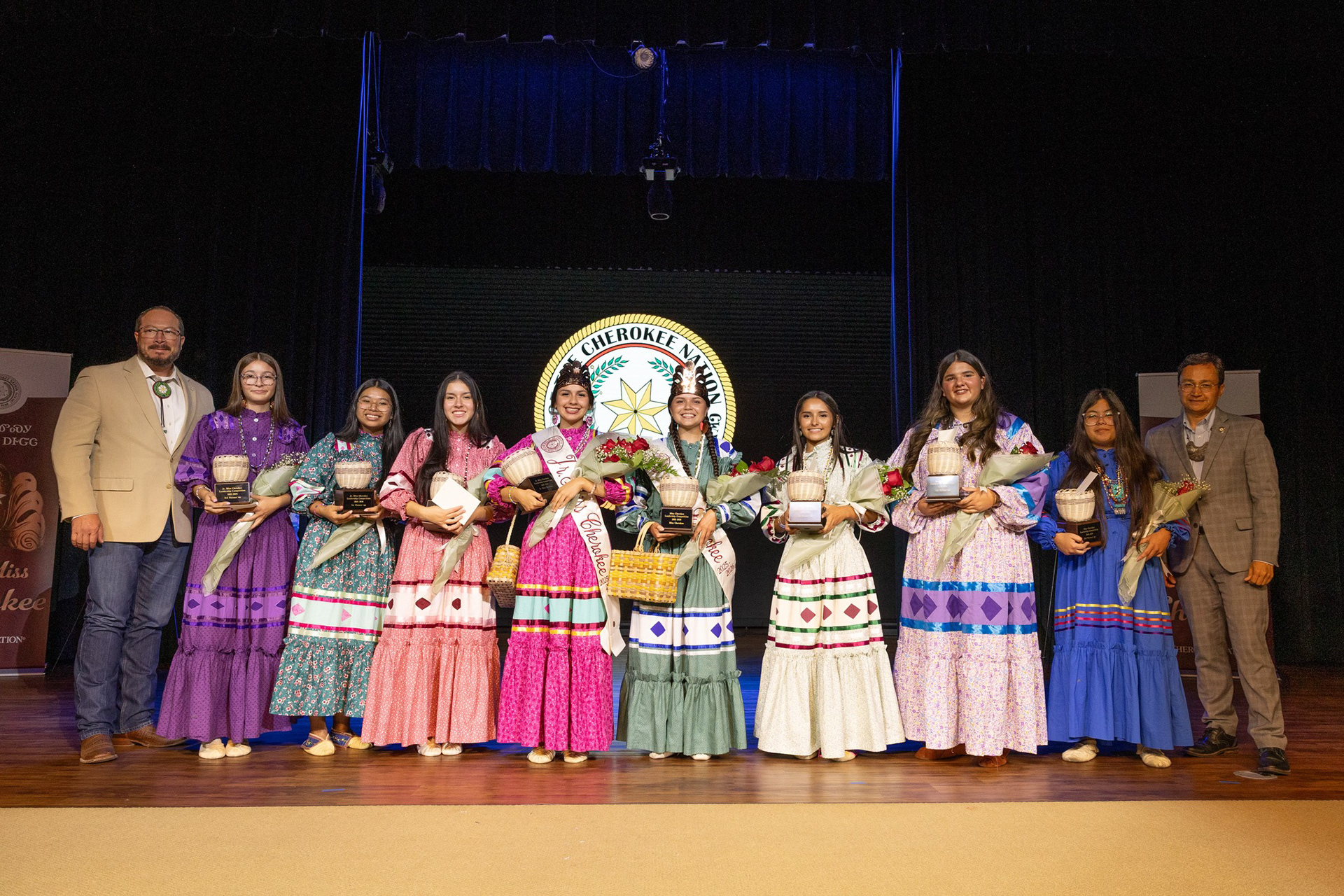 The official dress of the Cherokee Nation today is the 'tear' dress, named because the fabric is torn by hand rather than cut with scissors. Photo of the Miss Cherokee competition, 2025.