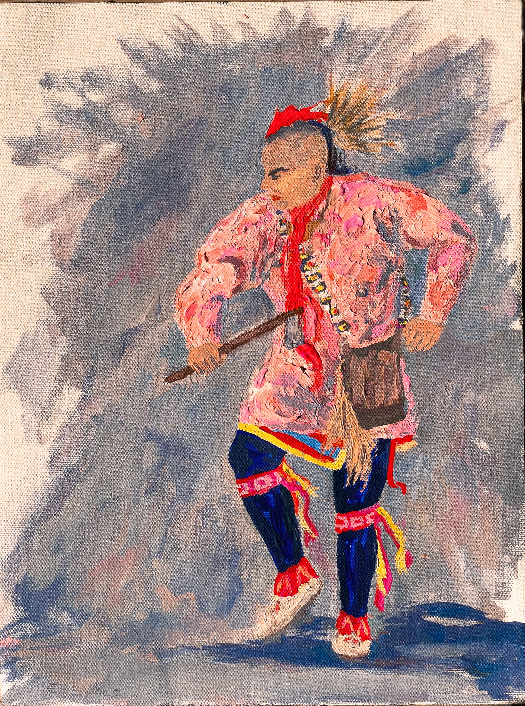 The traditional dancer in this painting is part of the Warriors of AniKituhwa, a Cherokee dance group with historically accurate Cherokee regalia.